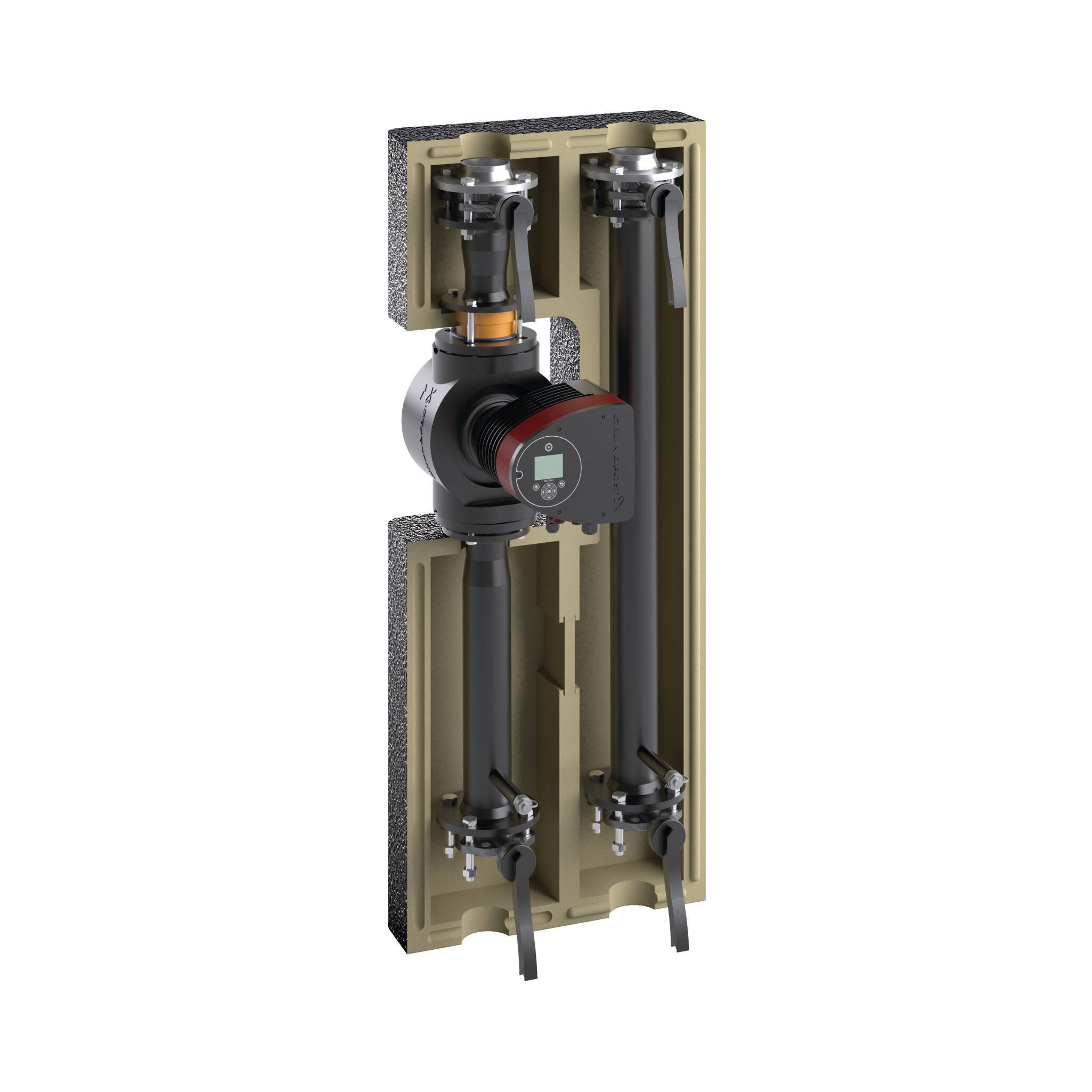 Flanschpumpengruppe bestehend aus vormontierten und fertig gedämmten Heizkreisen gem. GEG (Gebäudeenergiegesetz) zur direkten Montage ohne bauseitige Schweißarbeiten. Das gesamte ProfiFixx-System ist optisch einheitlich gedämmt. Die Dämmung wird über beigefügte rostfreie Spannbänder inkl. Schnellschraubverbindung montiert und kann zu Wartungszwecken wieder geöffnet und verschlossen werden. Die bauseitige Pumpe ist auch im Betrieb frei zugänglich, ohne dass die Dämmung entfernt werden muss.
