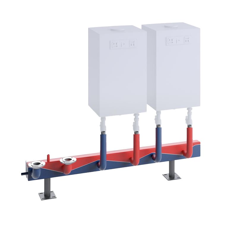 Kaskade zum sammeln der Volumenströme mehrerer Wärmeerzeugerkreise zur Übergabe an die Sekundärseite.Kombinierter Vor- und Rücklaufverteiler, bestehend aus Vierkantrohr mit nebeneinander angeordneten, durch sinusförmige Trennwand geteilte Kammern, mit direkt darunter liegender horizontal angeschweißter hydraulischer Weiche. Gewährleistet eine optimale hydraulische Entkopplung der verschiedenen Primär- und Sekundärkreise in allen Betriebszuständen. Keine sich beeinflussenden Pumpen bei Teil- und Volllast. Einsetzbar auch bei mehreren unterschiedlichen Wärme- oder Kälteerzeugern. Gefertigt aus schwarzem Stahlblech S235.Mit nach unten abgehendem Schlammfang inklusive Entschlammungsmuffe. Eine Muffe zur Platzierung des Weichenfühlers, zur Erfassung der sekundärseitigen Vorlauftemperatur für die Anlagenregelung, ist standardmäßig vorhanden und wird werksseitig an korrekter Stelle platziert. Ergänzende Fühlermuffen sind möglich.Das Bauteil ist werkseitig 100% dichtigkeitsgeprüft und grundiert.