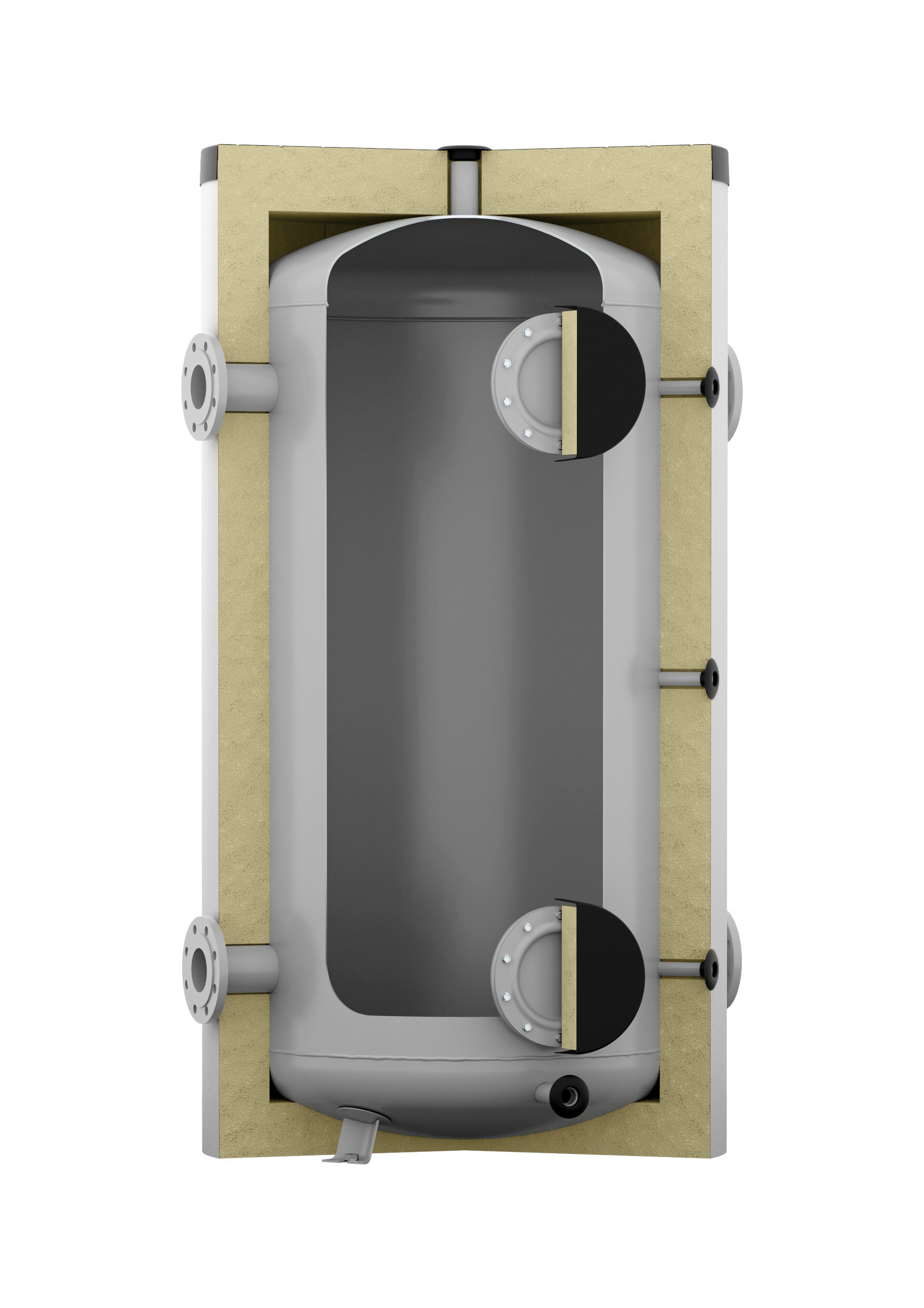 Die Anschlussstutzenreihen (DIN EN 1092-1) für Wärmeerzeuger und -verbraucher sind gegenüberliegend, als Lade- bzw. Entladestutzen angeordnet. Zwischen diesen Anschlussstutzenreihen sind ebenso vertikal angeordnete Einschraubmöglichkeiten für Fühlerhülsen, Thermometer o.ä. vorhanden (3 x Rp 1 1/2, 1 x Rp 1). Zusätzlich sind zwei DN 180 Flanschanschlüsse vorhanden. Speicherbehälter aus Stahl S235JR+AR, innen roh und aussen korrosionsgeschützt. Pufferspeicher bis 1000 Liter gedämmt mit 100mm, Pufferspeicher > 1000 Liter mit 120mm abnehmbarer Vliesdämmung, gemäß DIN 4102-1 Baustoffklasse B2. Speicher verfügbar in der Energieeffizienzklasse C. Die Warmhalteverluste sind auf extern zertifizierten Prüfständen ermittelt.
