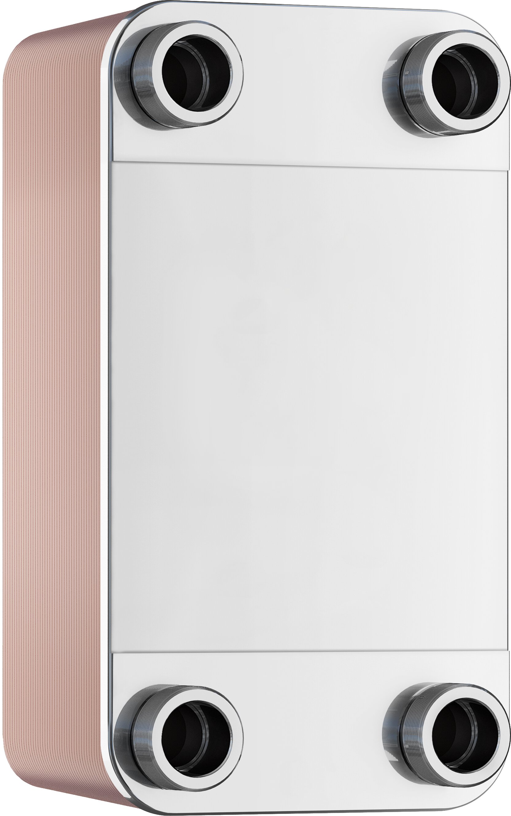 gelöteter eingängiger Plattenwärmetauscher aus Edelstahl (1.4404) mit Kupferlot vakuum-verlötet. Größen R..B-14 bis R..B-110 mit Gewindeanschluss, R..B-235 mit DIN Flanschanschluss.