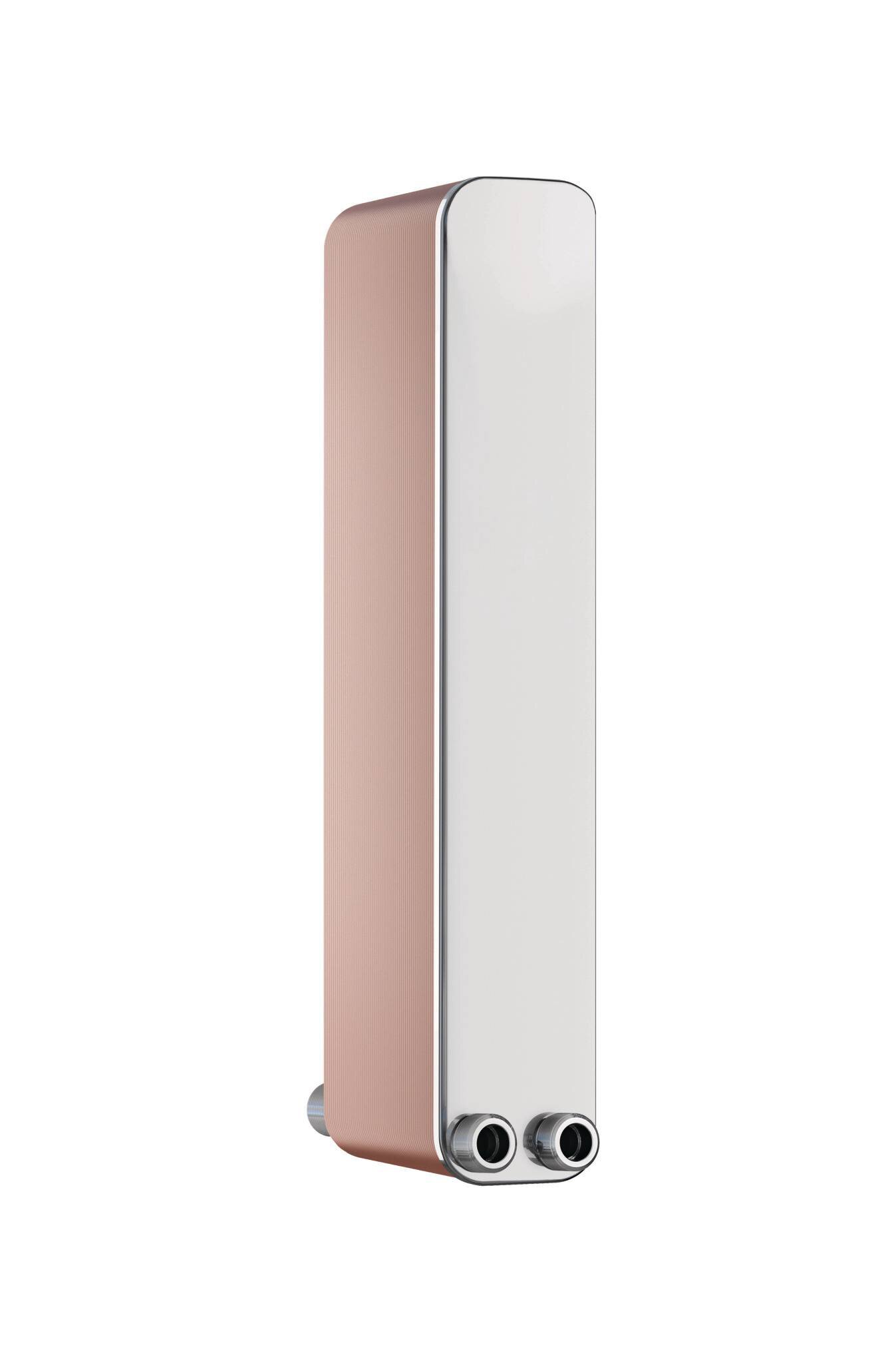 gelöteter zweigängiger Plattenwärmetauscher aus Edelstahl (1.4404) mit Kupferlot vakuum-verlötet. Größen R..B-14 bis R..B-110 mit Gewindeanschluss, R..B-235 mit DIN Flanschanschluss.