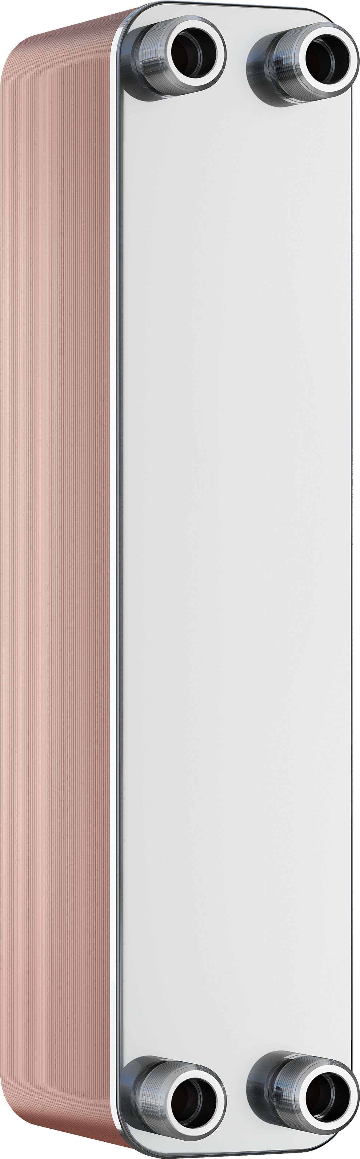 gelöteter eingängiger Plattenwärmetauscher aus Edelstahl (1.4404) mit Kupferlot vakuum-verlötet. Größen R..B-14 bis R..B-110 mit Gewindeanschluss, R..B-235 mit DIN Flanschanschluss.