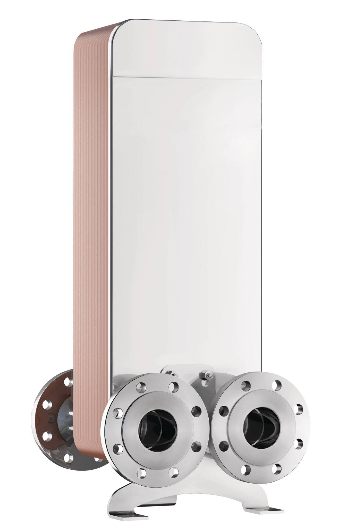 gelöteter zweigängiger Plattenwärmetauscher aus Edelstahl (1.4404) mit Kupferlot vakuum-verlötet. Größen R..B-14 bis R..B-110 mit Gewindeanschluss, R..B-235 mit DIN Flanschanschluss.