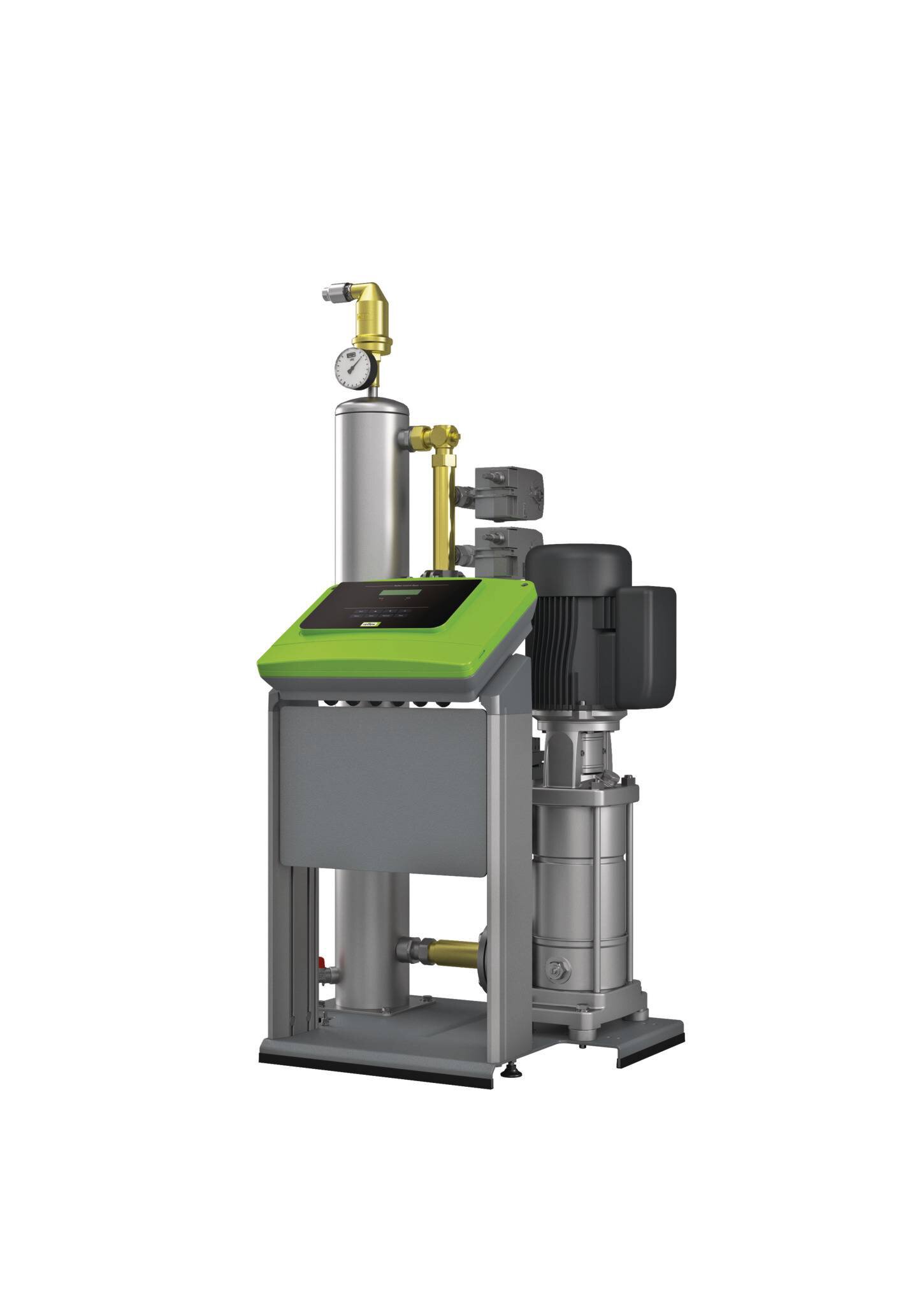 Vakuum-Sprührohrentgasung zur System- und Nachspeisewasserentgasung in geschlossenen Heizwasser- und Kühlkreisläufen, als vollautomatische Multifunktionseinheit mit "auto start"-Funktion und selbsttätigem hydraulischen Abgleich des Entgasungsprozesses sowie Steuerung und Überwachung der Nachspeisefunktion. Geeignet für die Medien Wasser und Wasser/Glykolgemisch bis zu einem Mischungsverhältnis von 50/50%. Funktionseinheit bestehend aus Hydraulikteil und Control Basic Steuerungs- und Bedieneinheit. Beides ist ergonomisch und wartungsfreundlich in ein modulares bodenstehendes Rahmensystem aus EV 1 eloxierten Aluminiumpräzisionsprofilen eingebunden und mit CE-Kennzeichen.Im Hydraulikteil erfolgt die Entgasung mittels einer Edelstahl-Kreiselpumpe in Verbindung mit in einem vertikal angeordneten Edelstahl-Vakuum-Sprührohr. Dieses ist mit Vakuumsprühdüse, Peilrohrentgasung und Druck-/Niveauüberwachung ausgerüstet. Die Control Basic Steuerung ist in ein robustes Kunststoffgehäuse integriert, in der sowohl die Leistungs- und Kommunikationselektronik und das Bedientableau mit schmutzunempfindlicher Folientastatur untergebracht ist. Control Basic ist eine vollautomatische frei parametrierbare Mikroprozessorsteuerung mit Echtzeituhr, differenzierendem Fehler- und Parameterspeicher, zweizeiliger Klartextanzeige für Systemdruck und allen relevanten Betriebs- und Störmeldungen, LED-Anzeige der Betriebsmodi und allgemeiner Fehlermeldung. Kommunikationselektronik bestehend aus: