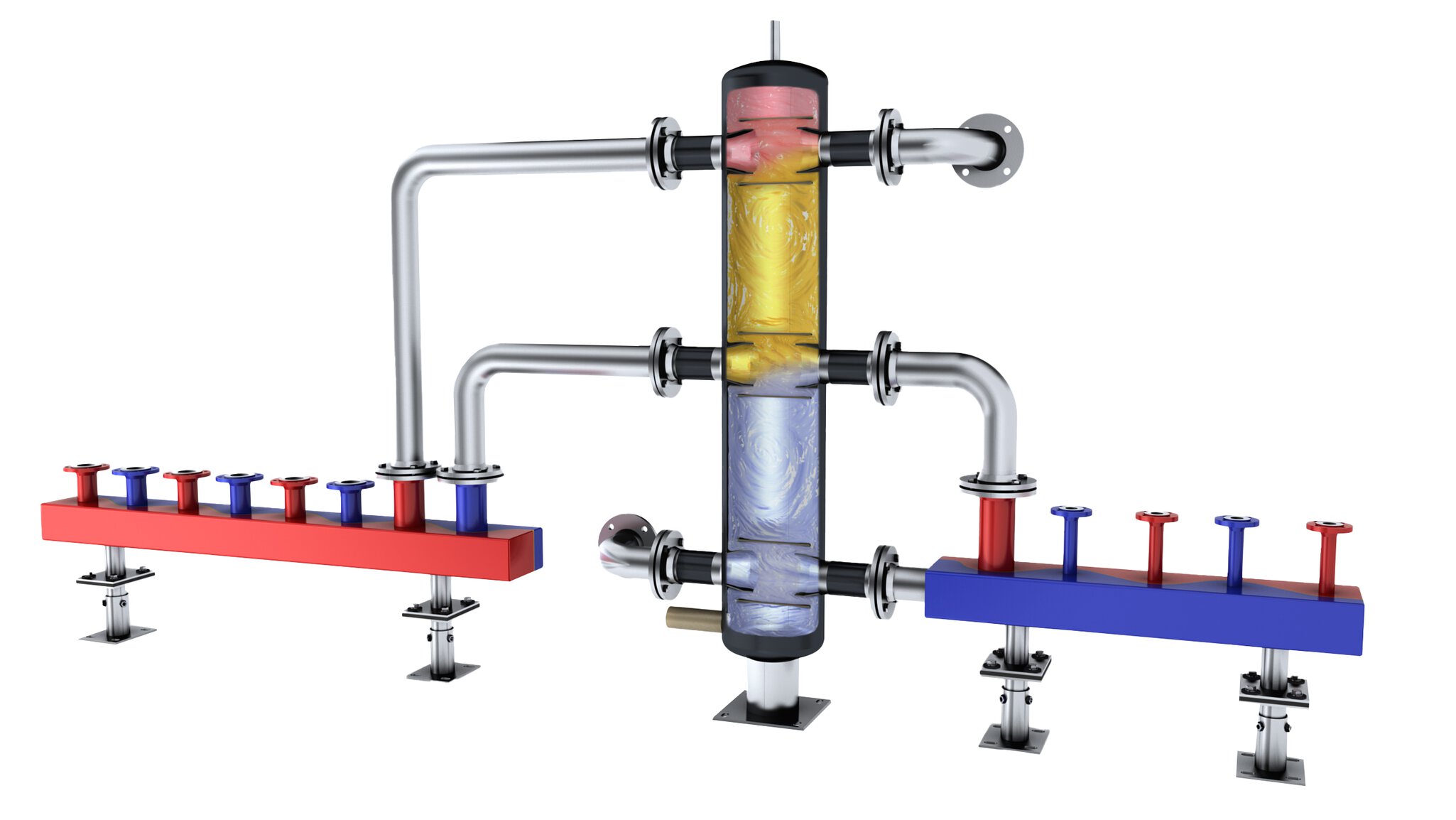 De MTW-wissel kan worden gebruikt als wissel-verdeelcentrale, hydraulische centrale en in de koeltechniek tegelijkertijd als buffertank.