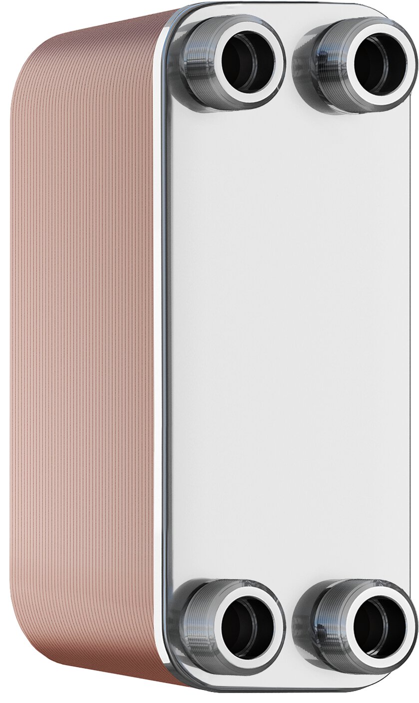 Gesoldeerde 1-weg platenwarmtewisselaar van roestvrij staal (1.4404) met koper soldeersel vacuüm-gesoldeerd. Maten R..B-14 tot R..B-110 met schroefdraadaansluiting, R..B-235 met DIN-flensaansluiting.