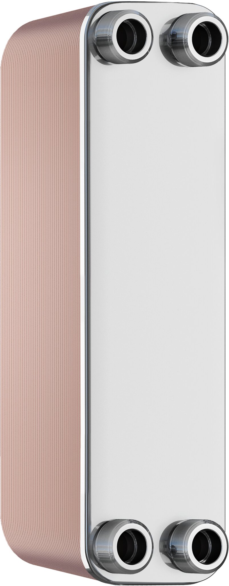 Gesoldeerde 1-weg platenwarmtewisselaar van roestvrij staal (1.4404) met koper soldeersel vacuüm-gesoldeerd. Maten R..B-14 tot R..B-110 met schroefdraadaansluiting, R..B-235 met DIN-flensaansluiting.